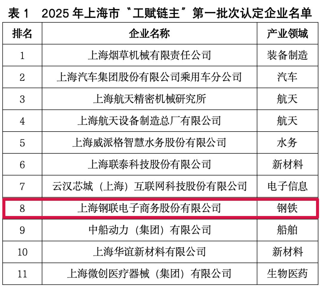 为贯彻落实《上海市制造业数字化转型实施方案》和《“工赋链主”梯度培育工程工作推进方案》等要求,市经济信息化委对2025年第一批次“工赋链主”培育企业开展了考核评估。经专家评审,形成2025第一批次“工赋链主”认定企业,上海钢联电子商务股份有限公司等11家企业榜上有名。具体名单如下: