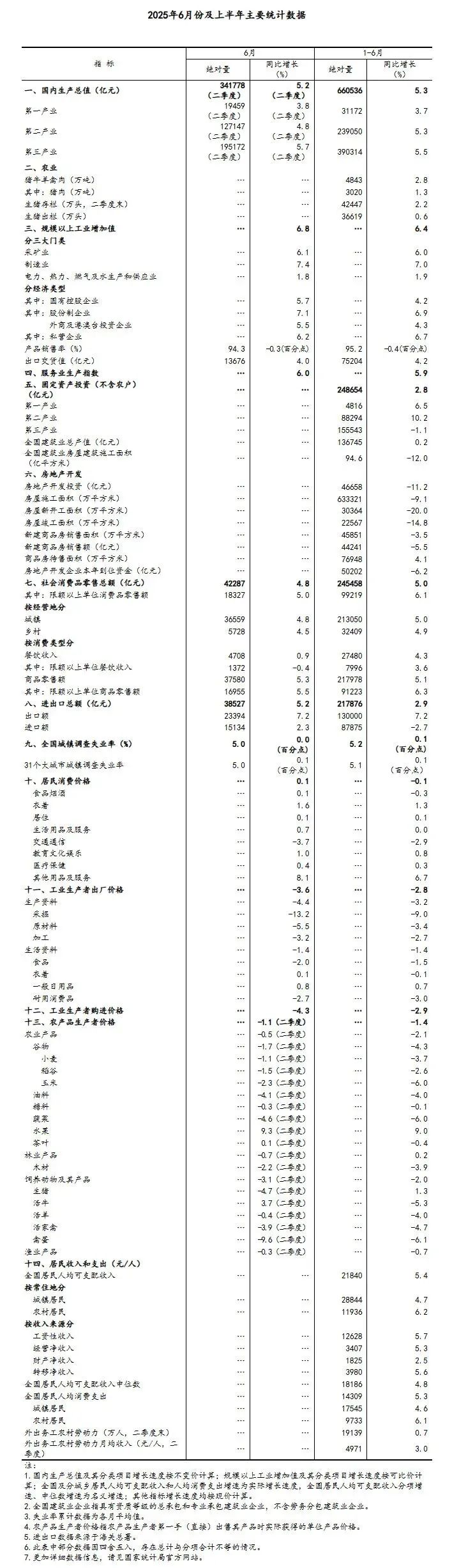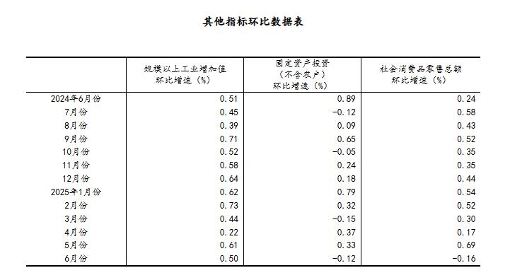 (2)根据季节调整模型自动修正结果,对近一年来各期国内生产总值、规模以上工业增加值、固定资产投资(不含农户)、社会消费品零售总额环比增速进行修订。修订结果及2025年二季度GDP环比数据、2025年6月份其他指标环比数据如下: