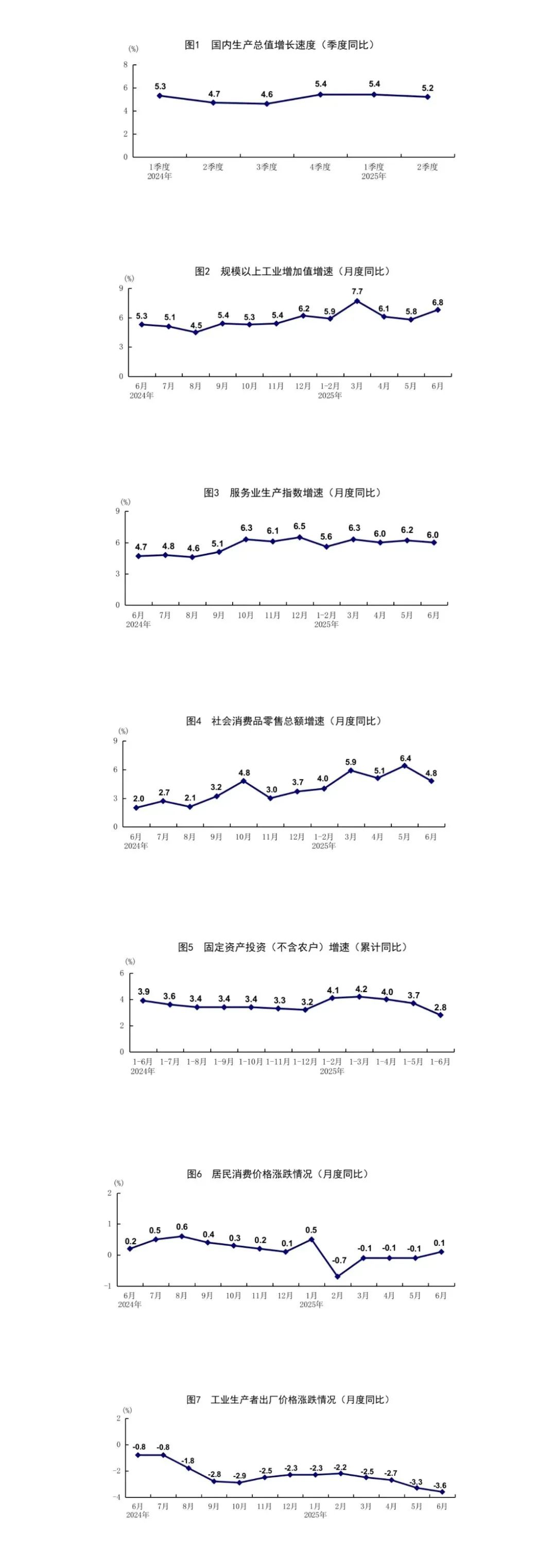 2024年各季度及2025年一季度、二季度GDP环比增速分别为1.4%、1.0%、1.3%、1.6%、1.2%和1.1%。