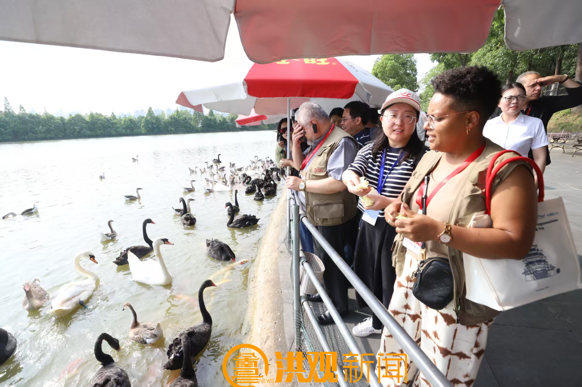 “快看,它们过来了!”艾溪湖湿地森林公园的天鹅湖畔,外媒嘉宾们化身“临时饲养员”,手持饲料吸引天鹅,水中锦鲤自在游弋。