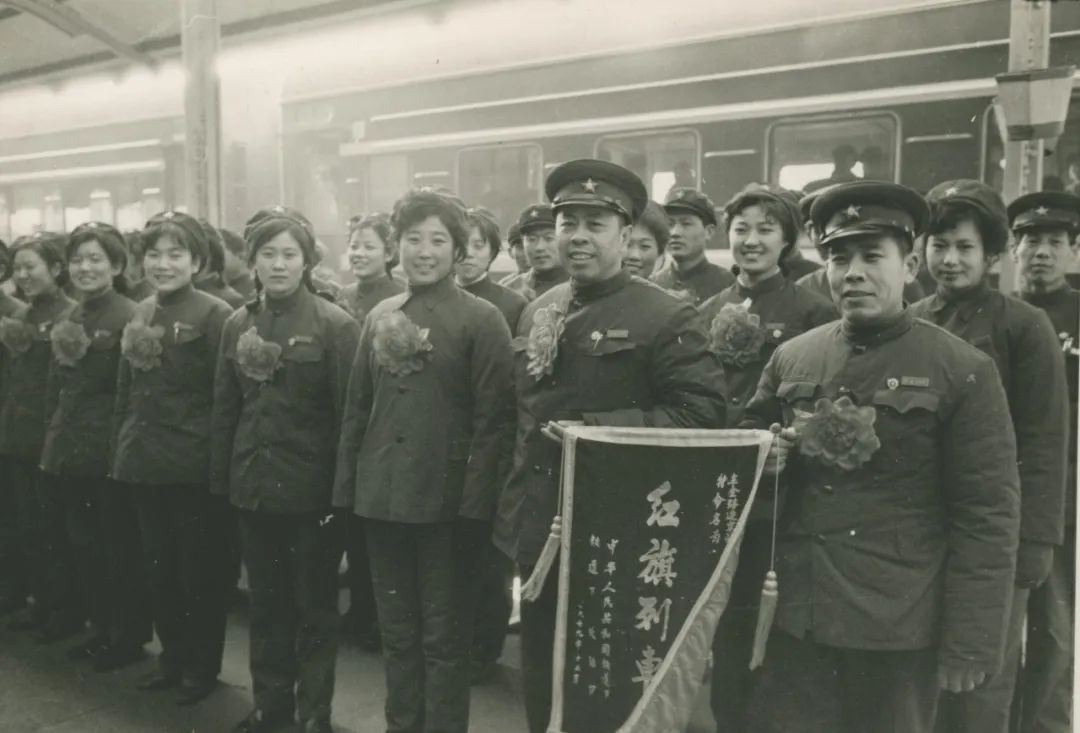 1979年10月26日,青岛站的站台上人山人海,热闹非凡,青岛列车段青京车队京四组的职工个个身着整洁干净的制服,胸前高挂大红花,昂扬挺拔地站在列车前,他们接过代表全路最高荣誉的“红旗列车”锦旗,心中是满满的自豪。