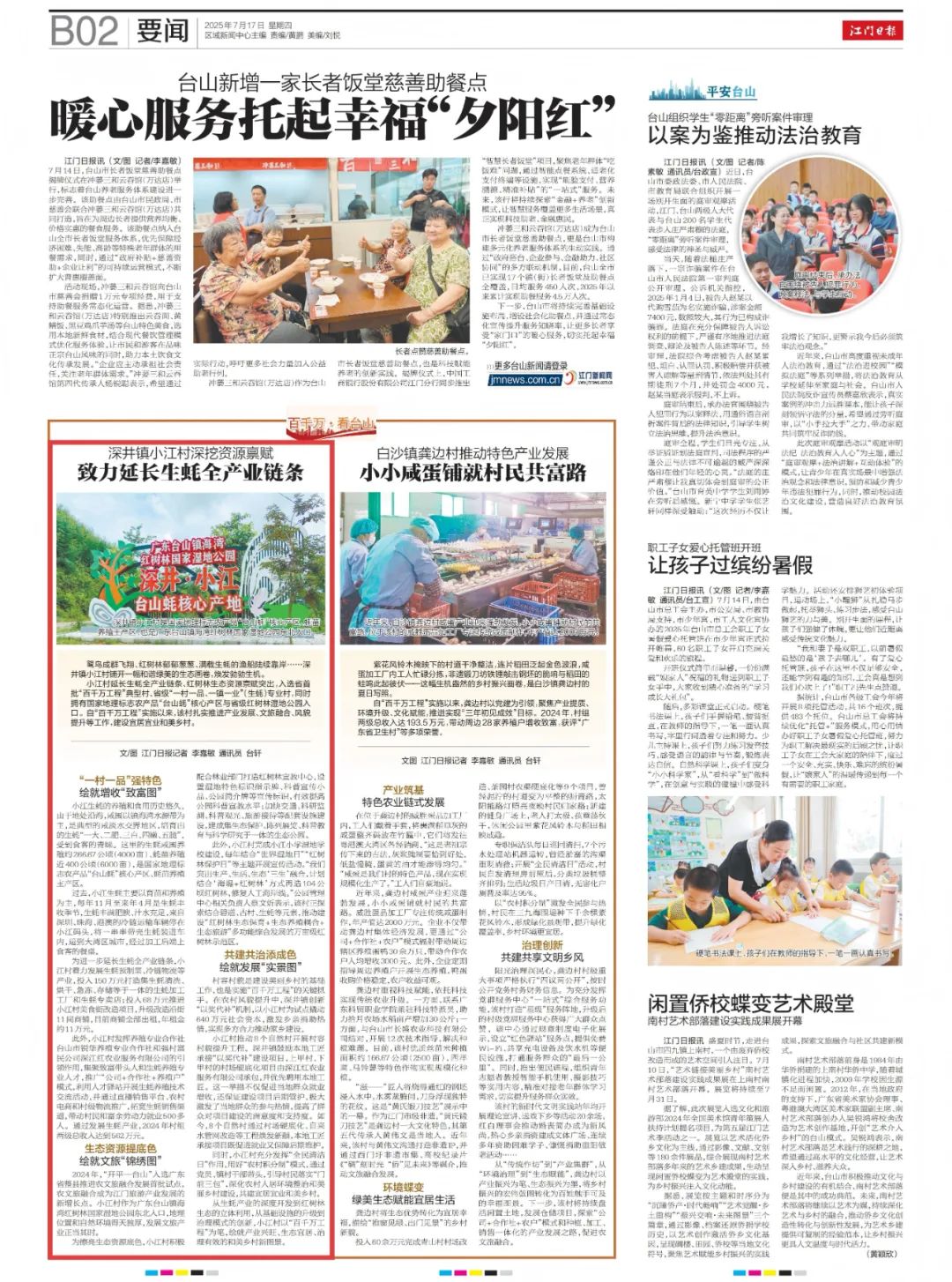 《江门日报》2025年7月17日 第B02版鹭鸟成群飞翔、红树林郁郁葱葱、满载生蚝的渔船陆续靠岸……深井镇小江村铺开一幅和谐绿美的生态画卷,焕发勃勃生机。