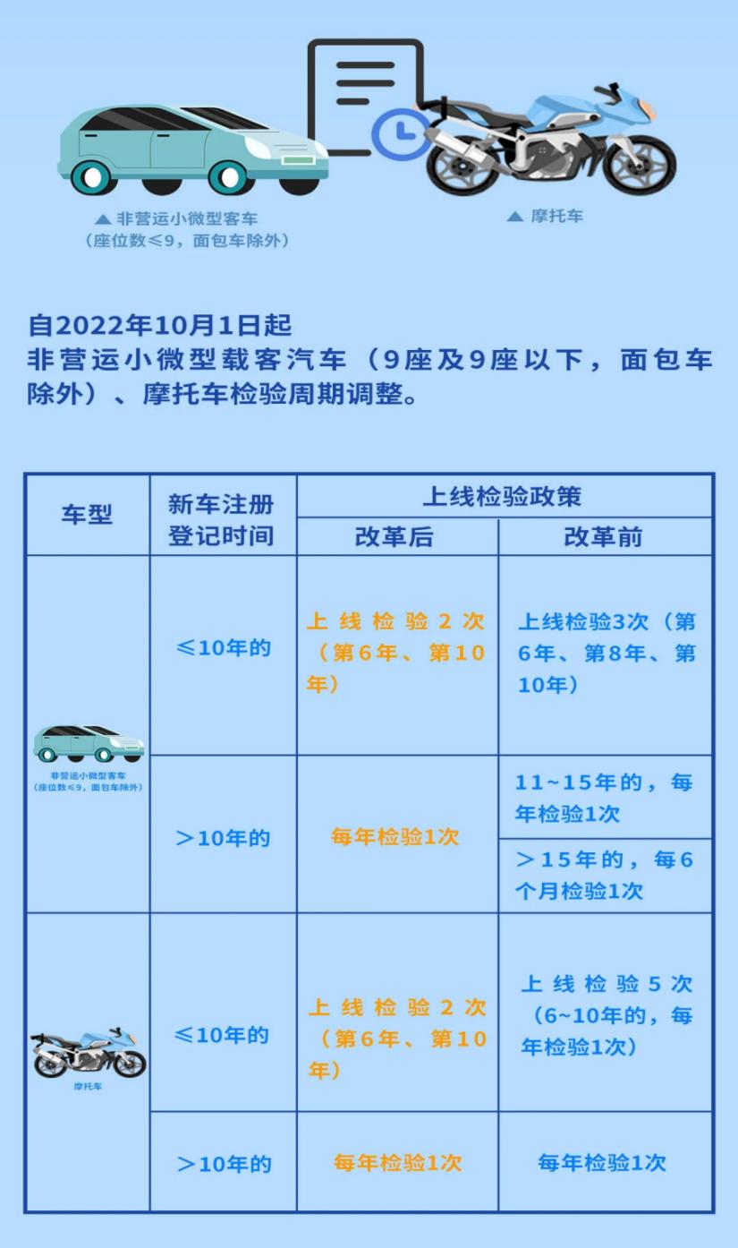 ●非营运小微型载客汽车(面包车除外)、摩托车:第6年、第10年进行安全技术检验,在10年内每两年向公安机关申领检验标志;超过10年的,每年检验1次。