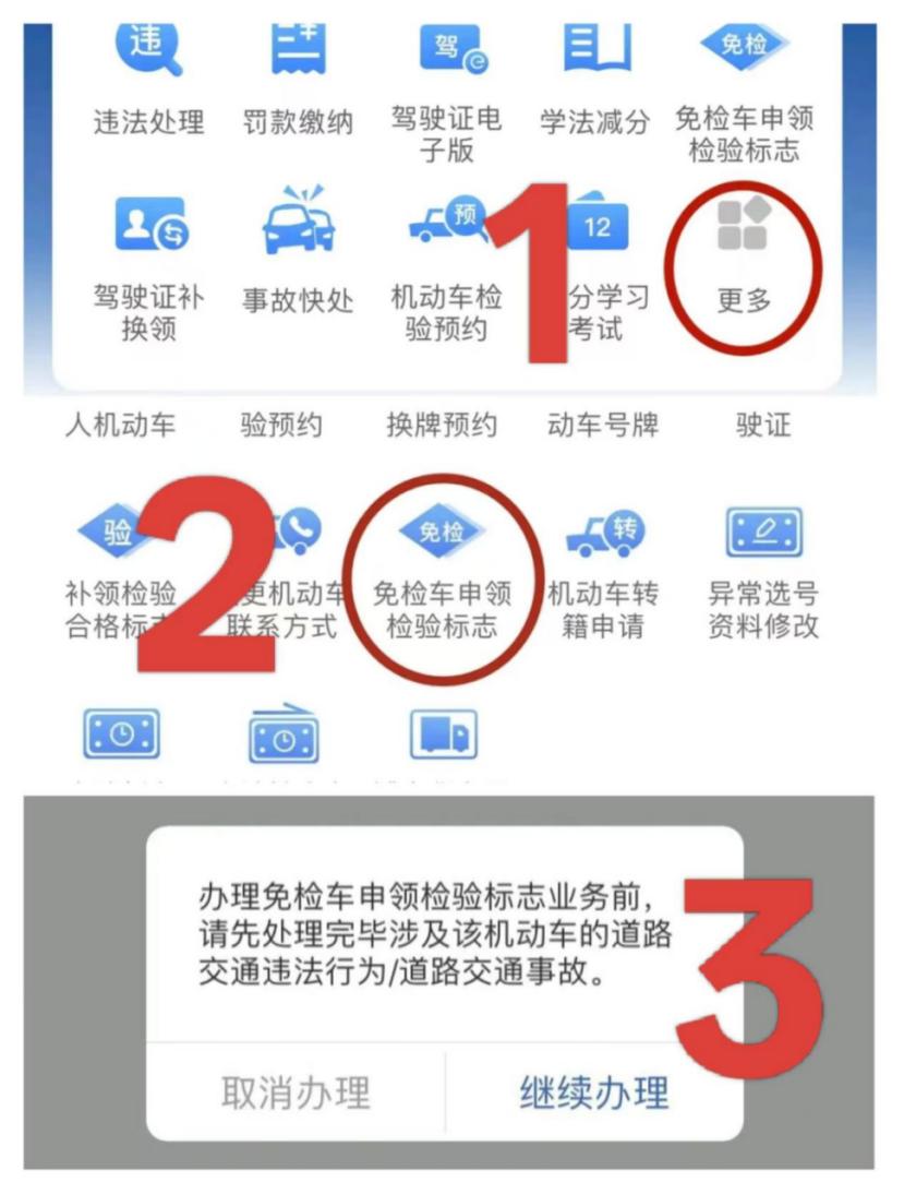 1.登录交管“12123”APP,点击首页【更多】→ 机动车业务 → 免检车申领检验标志 → 确认是否处理完毕道路交通违法行为/道路交通事故。