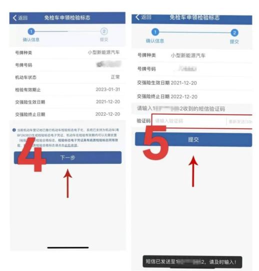 2.核实车辆相关信息 → 绑定手机号码获取验证码 → 提交申请(即可获得检验标志电子凭证)。