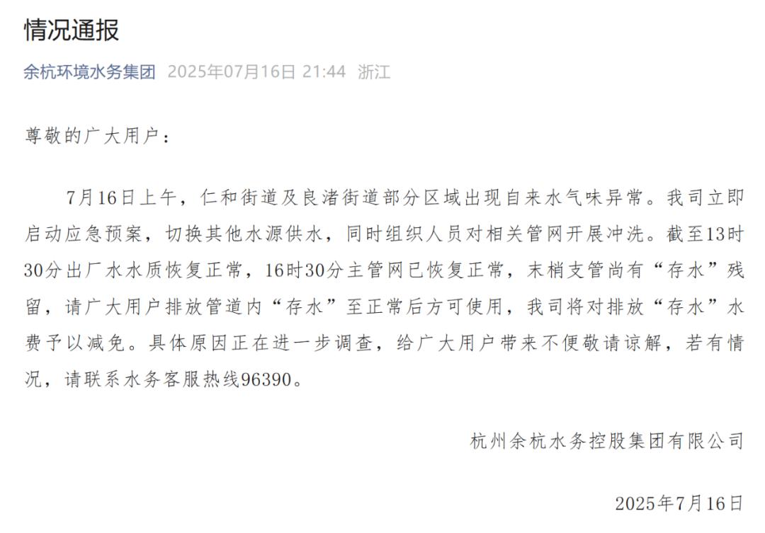 当天晚上,余杭环境水务集团发布情况通报,表示截至13时30分出厂水水质恢复正常,16时30分主管网已恢复正常,末梢支管尚有“存水”残留,请用户排放管道内“存水”至正常后使用。