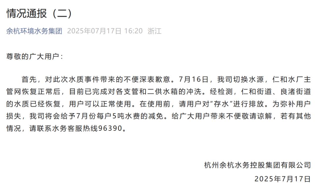 17日下午,余杭环境水务集团发布第二次情况通报,表示经过检测,仁和街道、良渚街道水质已经恢复,再次强调请用户对“存水”进行排放。并表示为弥补用户损失,会给予每户5吨水费的减免。