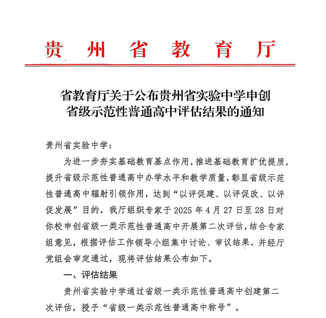 近日,我校附中——贵州省实验中学于2025年7月正式获评贵州省省级一类示范性普通高中。