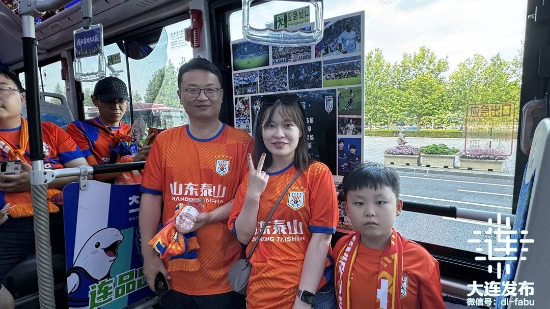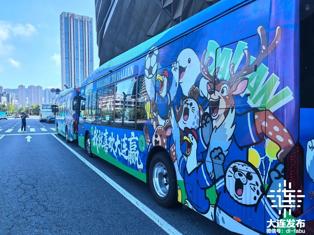 22辆来自大连公交集团五分公司的大巴有序穿梭在城市道路上,搭载着山东泰山队球迷前往赛场。一路上,“我就喜欢大连赢” 的标语与充满活力的车身图案,让大连这座 “足球城” 的氛围愈发浓烈,充分展现出大连的热情与活力。