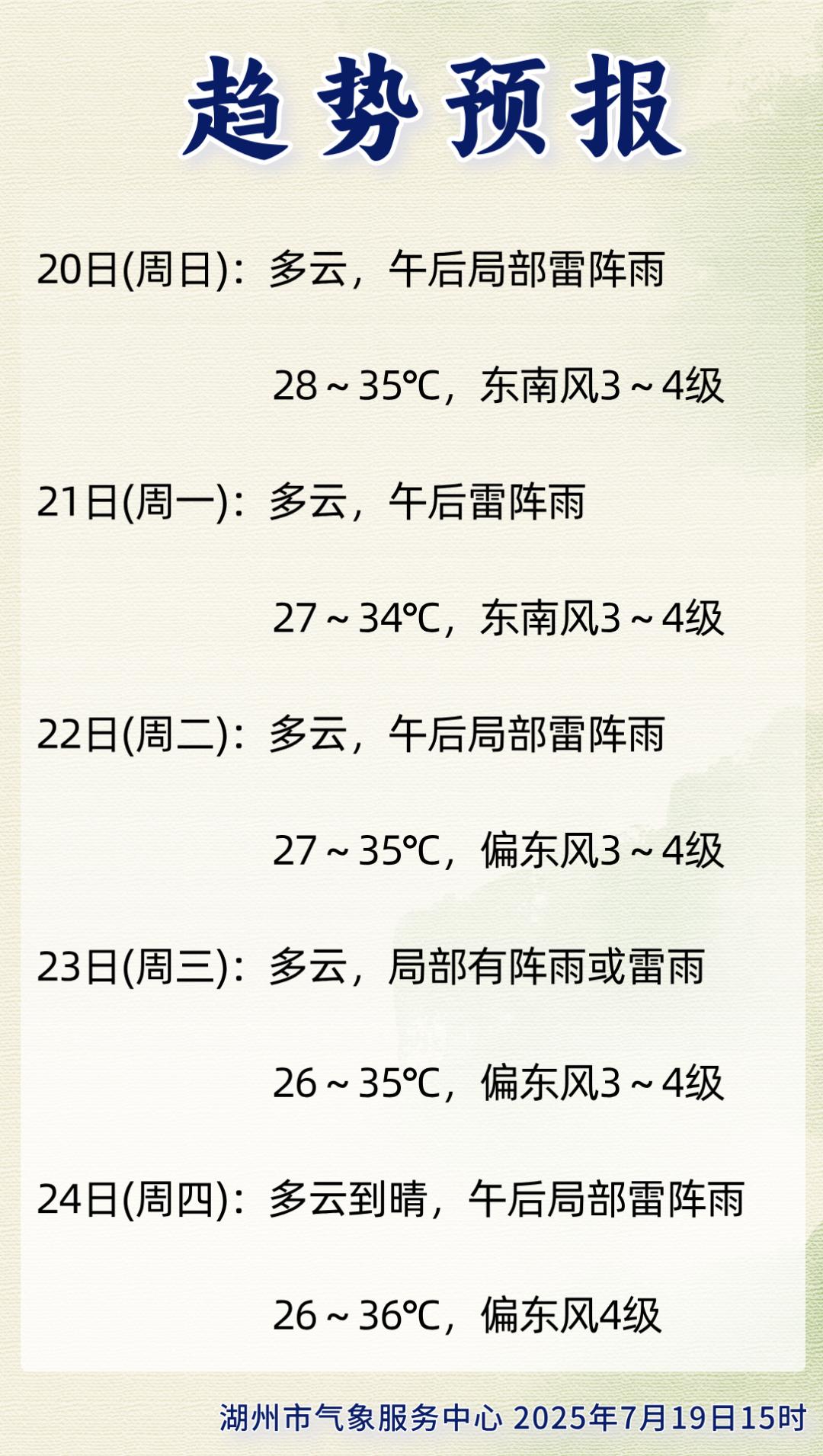 今天夜里到明天多云,午后局部雷阵雨,后天多云,午后雷阵雨,东南风3~4级,明晨最低气温:28℃;明天最高气温:35℃。