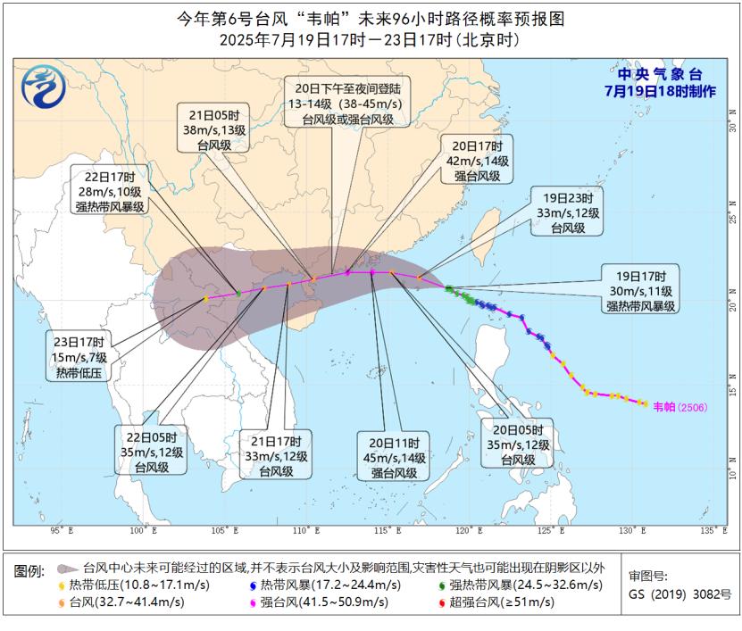 今年第6号台风“韦帕”(强热带风暴级)的中心今天(19日)下午5点钟位于广东省阳江市偏东方约700公里的南海东北部海面上,就是北纬20.7度、东经118.6度,中心附近最大风力有11级(30米/秒),中心最低气压为980百帕,七级风圈半径为280~360公里,十级风圈半径为50~80公里。