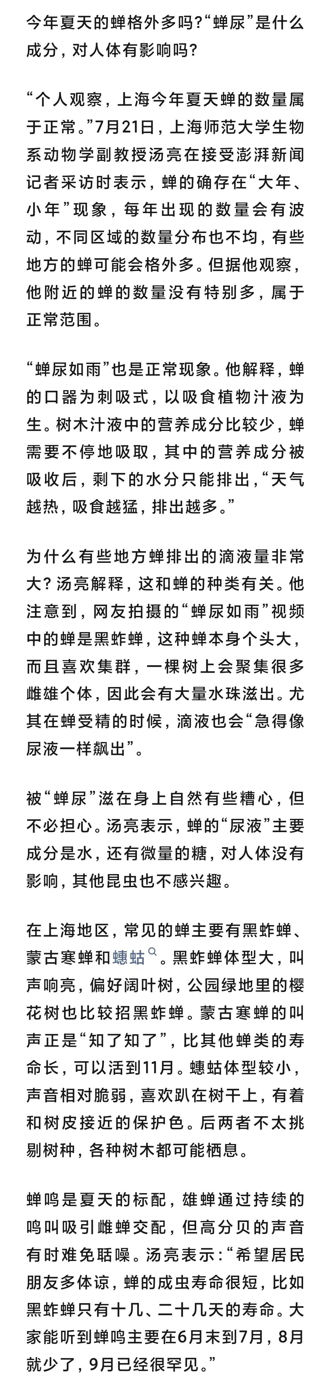 盛夏,知了叫个不停。有网友发帖称,上海的蝉多到“蝉灾的程度”,叫得让人耳膜痛,走在树下冷不丁被“蝉尿”飙了一头。澎湃新闻记者检索发现,“蝉尿如雨”的情况在全国多地都有出现。