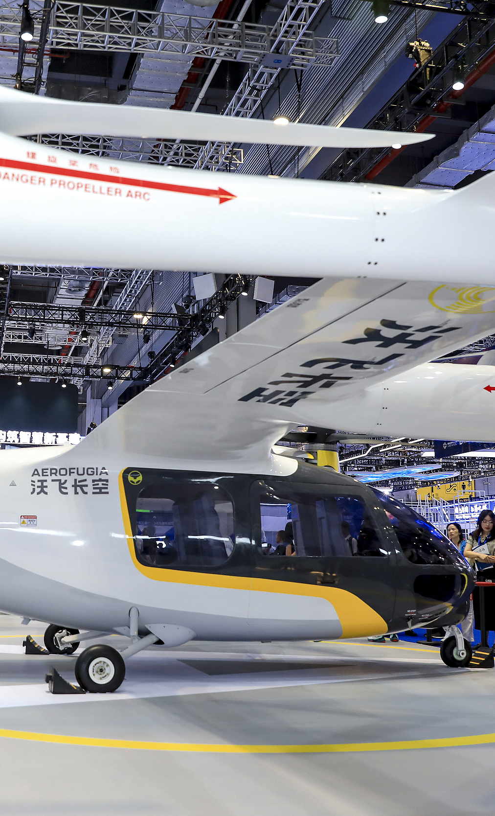 观众参观御风未来2吨级载人电动垂直起降飞行器(eVTOL)M1模型。