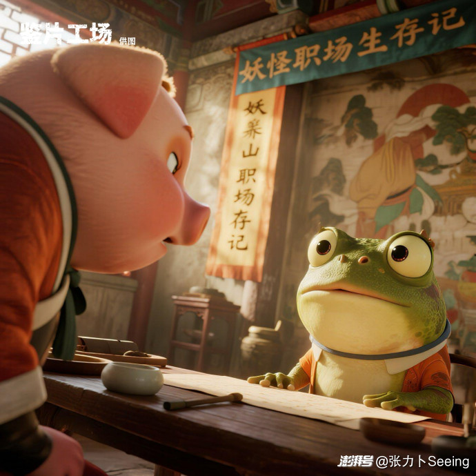 底层叙事的一贯性:从“禽兽超人”到“妖怪打工人”,於水的动画创作始终聚焦“被遗忘的大多数”。在《禽兽超人》中,他塑造了白天打工、夜晚变身超人的“否否”,揭露平凡英雄的生存困境;而《浪浪山小妖怪》则将镜头对准《西游记》叙事缝隙中的无名小妖,构建了“孙悟空到来之前”的底层视角。这种“非主流补写”打破了传统神话对英雄叙事的垄断,当唐僧师徒作为“国家级项目团队”西天取经时,小猪妖们正在为“大王洞编制”奋斗三年而不得,其“考编失败”的经历与当代青年考公内卷形成残酷隐喻。导演通过身份置换的幽默手法,让妖怪职场与人类社会形成镜像,野猪毛刷锅时“祖爷爷的字都刷没了”的细节,恰似打工人通宵改方案却被领导当众否定的日常;蛤蟆精随身携带“玖玖捌壹”工牌的执念,则道尽体制内边缘人对“稳定”的病态渴望。