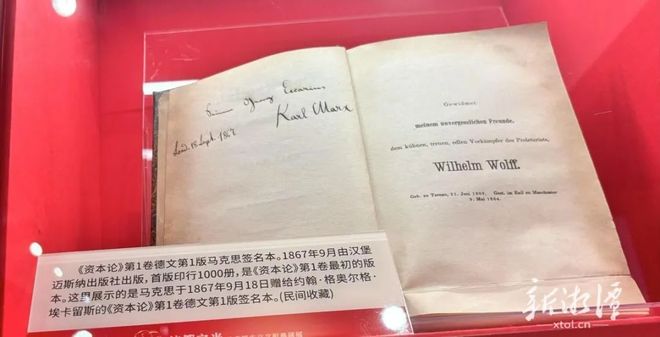 《共产党宣言》作为马克思主义诞生的重要标志,自问世以来被翻译成多种语言在世界各地发行,彰显出马克思主义跨越时空的永恒魅力与强大生命力。此次展览不仅有陈望道翻译的首个中文全译本,还有不同外文版本的《共产党宣言》。其中,目前全球发现的唯一一本马克思签名的《共产党宣言》备受关注,这本1848年德文版著作封面上,马克思的字迹清晰可见。