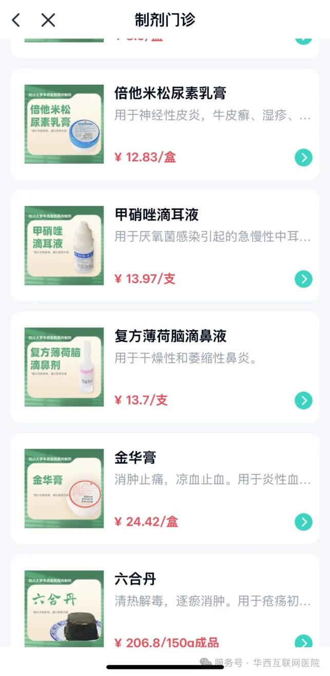 记者了解到,目前“制剂门诊专区”已上线9种院内制剂,主要针对皮肤性疾病(急性皮炎、湿疹、神经性皮肤、瘙痒性皮肤病等);急慢性中耳炎;鼻炎;痔疮等疾病。这九种院内制剂包括:倍他米松尿素乳膏、甲硝唑滴耳液、复方薄荷脑滴鼻液、金华膏、六合丹、炉甘石酚涂剂、硼酸滴耳液、松馏油氧化锌软膏、苯酚薄荷脑乳膏。后续,相关制剂还将持续上新。