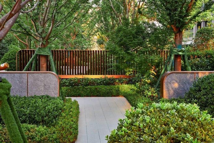 楼宇之间,宅间花园种植了乌桕、海棠、朴树、金桂、枫树、山杏、白蜡、樱花等丰富植被,四时皆景,各展芳华。绿意掩映之下,旭辉新一代T-tower美学立面品质卓然,勾画靓丽的城市风景线。