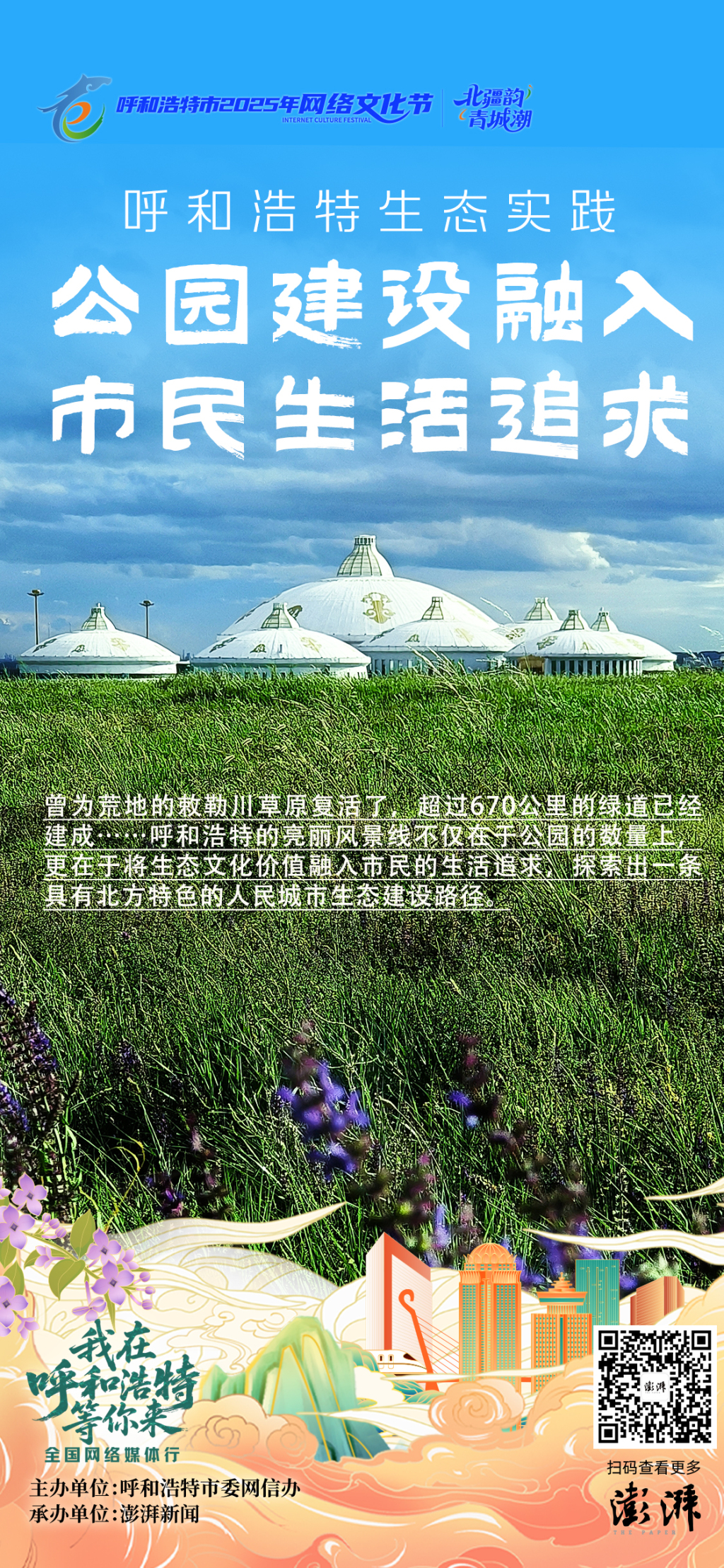 “北疆韵 青城潮”2025年呼和浩特市网络文化节系列活动之一,由呼和浩特市委网信办主办、澎湃新闻(www.thepaper.cn)承办的“我在呼和浩特等你来”全国网络媒体行走进呼和浩特,探寻城市建成区1009座公园星罗棋布、绿地率高达41.13%、青城绿道总长已超过670公里的生态建设经验。