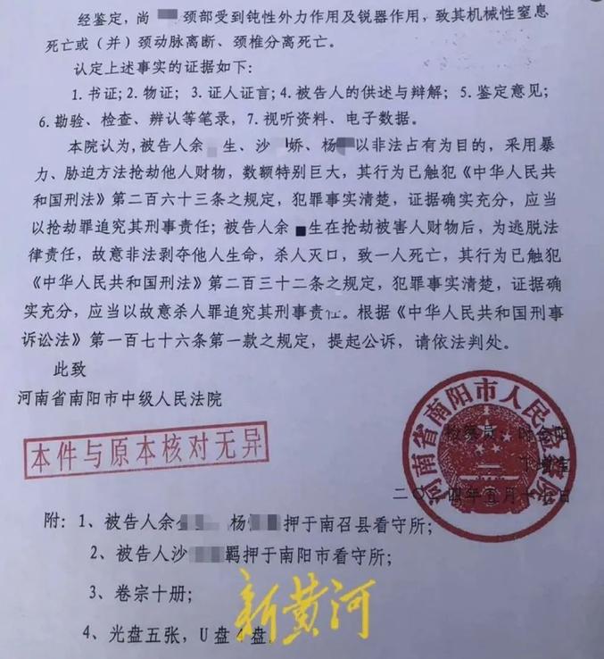 罗大美家属提供的检方起诉书显示,涉案3人分别为余某某、沙某某、杨某。检方查明,2023年7月5日晚,按照余某某的指使,杨某将尚某锋(罗大美原名)诱骗至南阳市内余某某的出租屋。余某某将尚某锋控制后,指使其同居女友沙某某支付杨某500元。随后,余某某伙同沙某某将尚某锋转移至南召县南河店镇桑树坪村,其间通过恐吓,胁迫尚某锋向沙某某的微信、支付宝、银行卡账户转账。7月7日凌晨,在向尚某锋索要二百余万元后,余某某与尚某锋独处期间将其杀害,并将尸体推入红薯窖掩埋。