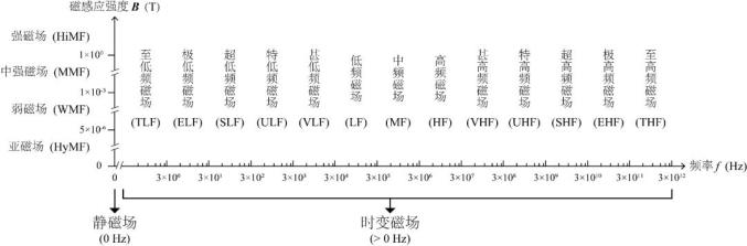 根据电磁场磁感应强度和方向是否随时间变化,电磁场可以分为不随时间变化的静磁场(static magnetic fields),以及随着时间变化的动磁场,又称时变磁场(time-varying magnetic fields)两大类。静磁场就是我们常见的冰箱贴、指南针等产生的磁场,依据磁感应强度大小,可以人为划分为亚磁场(hypomagnetic field,HyMF,<5 μT)、弱磁场(weak magnetic field,WMF,5 μT~1 mT)、中强磁场(moderate magnetic field,MMF,1 mT~1 T)和强磁场(high magnetic field, HiMF,>1 T)[1-2]。时变磁场则是Wi-Fi路由器、家用电器等产生的磁场,根据磁场强度随时间的变化方式可分为正弦电磁场、脉冲电磁场、随机磁场等,也可用电磁波的频率来表征一定的电磁场。《中华人民共和国无线电频率划分规定》[3]依据不同的频率将电磁波内无线电波划分为13个频段。