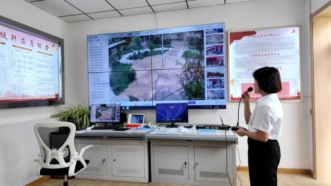 我们中铺镇高风险企业多、市场经营主体多、流动人口多,我身后的应急智慧监管平台兼具自然灾害风险监测、应急值班值守等功能于一体,基本实现了对全镇灾害事故高风险部位的 24小时全覆盖监控、智能化预警,实现预警信息实时报送,对监控区域语音播报和实时AI监控服务,真正达到“一屏看全镇,一网管所有”的效果。