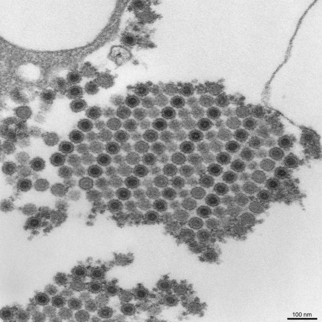 基孔肯雅热病病毒颗粒的投射电子显微镜下照片。基孔肯雅热是由基孔肯雅病毒引起的一种急性传染病,主要通过埃及伊蚊、白纹伊蚊(即咱们常见的“花蚊子”)叮咬传播。