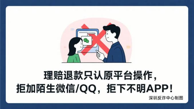 “理赔/退款”型: 索要敏感信息、诱导屏幕共享/远程控制、谎称“退款过多需返还”、诱导向“安全账户”或境外账户转账。