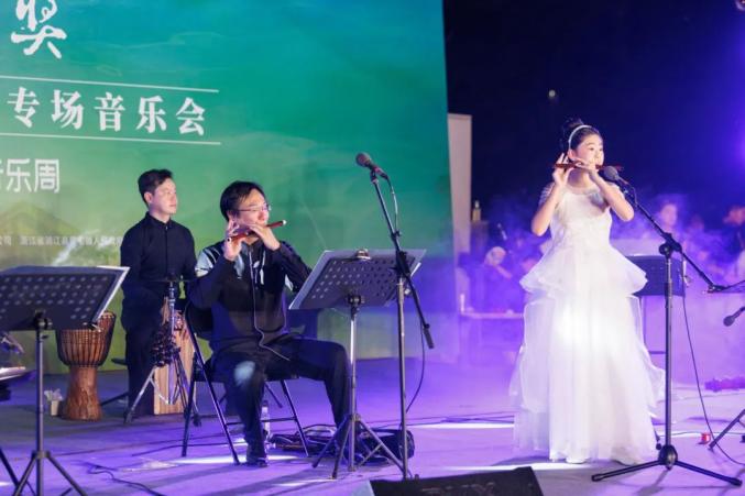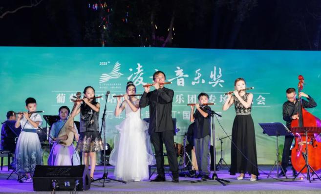 成立于2022年的“炫乐团”,以其融合竹笛、钢琴、琵琶、低音提琴和打击乐的中西特殊组合及创新演奏风格,已成为国内乐坛备受瞩目的团体。当晚,他们为浦江观众带来了风格多样的曲目:既有《彩云追月》的江南婉约,也有《西域之光》的异域奔放。乐团特别演奏的改编曲目《你好!周同学》,将周杰伦的经典旋律以室内乐形式重新演绎。中西乐器间的巧妙对话赋予作品清新格调,熟悉的音符在星空下的葡萄园中流淌,引发了不少年轻观众的强烈共鸣。“刚才听的《你好!周同学》把周杰伦的经典流行歌曲,用琵琶、笛子这些传统乐器串烧演绎出来,既能吸引我们年轻人,也不会让老一辈观众觉得陌生。”观众徐宇俊对此深有感触。