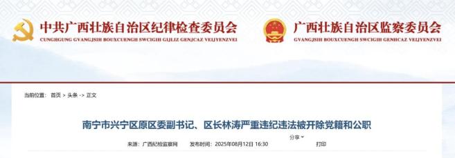 原标题:《南宁市兴宁区原区委副书记、区长林涛严重违纪违法被“双开”》