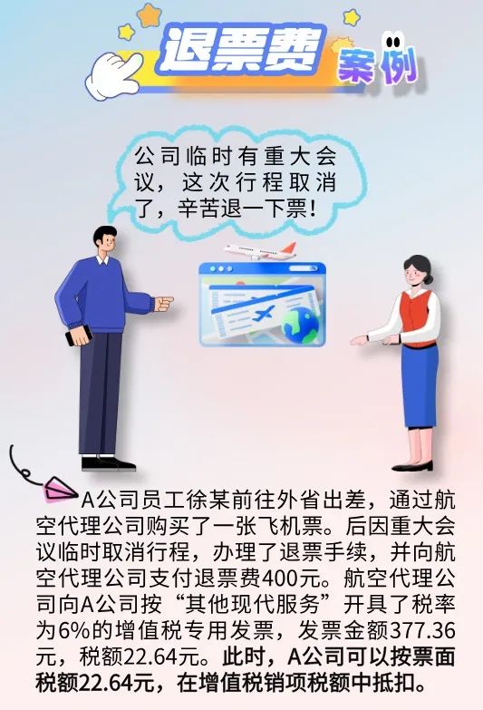 Tips:实务中,退票费能否抵扣取决于在多种增值税扣税凭证中是否取得了适合此种情形的扣税凭证。公司如果取得了售票方开具的项目名称为“其他现代服务”的增值税专用发票,可以按发票上注明的税额从销项税额中抵扣;如果取得了售票方开具的增值税电子普通发票、数电发票中的电子发票(普通发票),均不能作为增值税扣税凭证来抵扣增值税销项税额。
