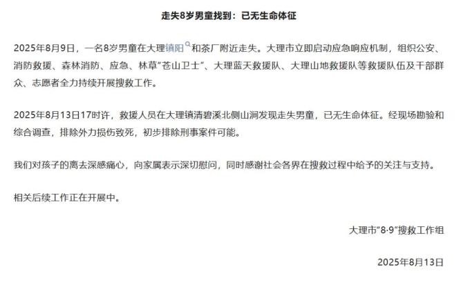 2025年8月13日17时许,救援人员在大理镇清碧溪北侧山涧发现走失男童,已无生命体征。经现场勘验和综合调查,排除外力损伤致死,初步排除刑事案件可能。