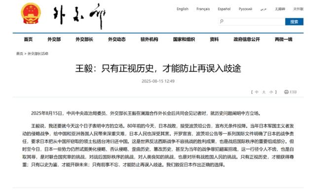 王毅说,我还要就今天这个日子表明中方的立场。80年前的今天,日本战败,接受波茨坦公告,宣布无条件投降。当年日本军国主义者发动的侵略战争,给中国和亚洲各国人民带来深重灾难,日本人民也深受其害。开罗宣言、波茨坦公告等一系列国际文件明确了日本的战争责任,要求日本把从中国所窃取的领土包括台湾归还中国。这是世界反法西斯战争不容挑战的胜利成果,也是战后国际秩序的重要组成部分。但时至今日,日本一些势力仍然试图美化侵略、否认侵略、歪曲历史、篡改历史,甚至为当年的战争罪犯翻案招魂,这一行径令人不齿,也是自取其辱,是对联合国宪章的挑战,对战后国际秩序的挑战,对人类良知的挑战,也是对所有战胜国人民的挑战。只有正视历史,才能获得尊重;只有以史为鉴,才能开辟未来;只有前事不忘,才能防止再误入歧途。我们敦促日本作出正确的选择。