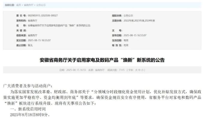 为落实国家发展改革委、财政部、商务部关于“分领域分时段细化资金使用计划,优化补贴发放方式,确保政策实施更加平稳有序、资金均衡用到年底”等要求,确保资金规范安全有序使用,省服务平台对家电和数码产品“焕新”板块进行系统升级。据悉,8月18日8时家电及数码产品“焕新”新系统启用,家装厨卫“焕新”和电动自行车以旧换新新系统启用时间将另行通知。