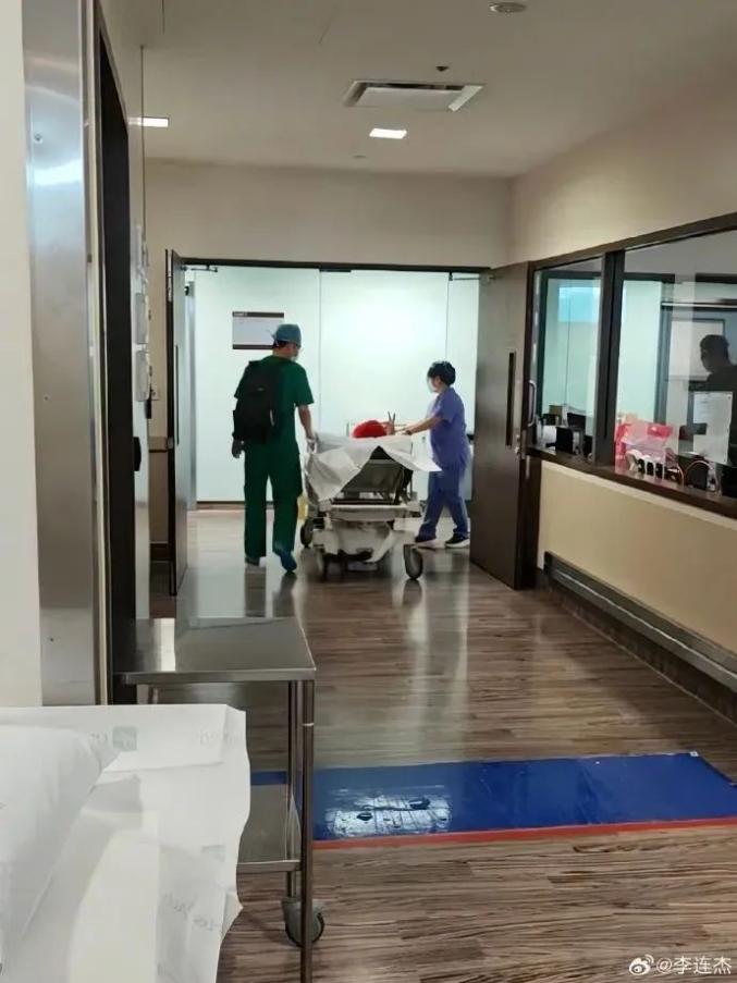 两张配图中,一张是李连杰躺在病床上,另一张图片是手术室的照片。