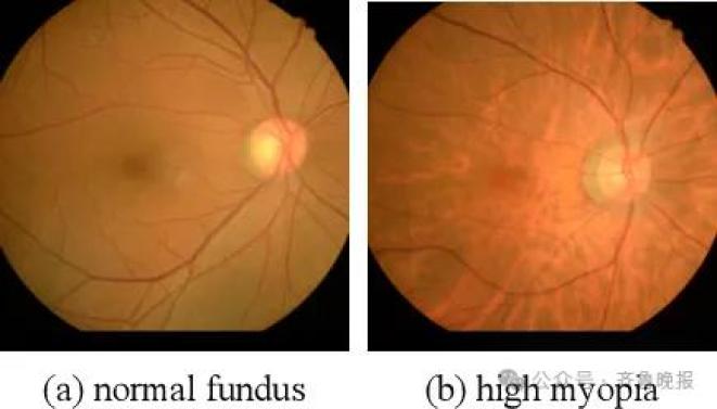 上图右侧图(b)是一个高度近视的人的眼底,有一些像裂开一样的纹理。图片来源:文献