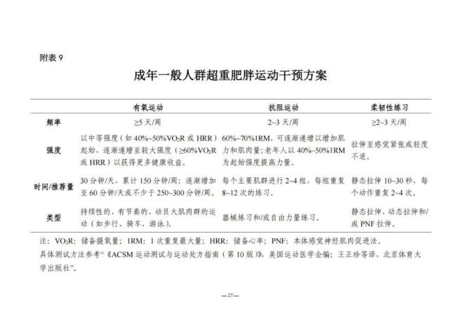 进行有氧运动干预时,建议由小运动量开始,逐渐达到 30 分钟/天的中等至较大强度。对于运动依从性较差的个体,可以通过累计多次、每次不少于 10 分钟的连续运动达到总的运动量。为了实现长期控制体重的效果,建议应逐渐达到至少 250 分钟/周(或消耗≥2000千卡/周)中等至较大强度运动,且将运动分在每周的 5~7 天内进行。可根据年龄、健康状况和运动能力采用不同的运动方法进行运动干预(见附表 9)。