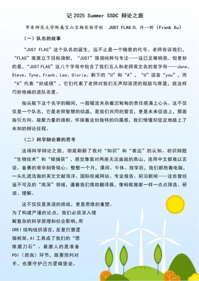 暑假,我意外成为SSDC辩论二队Rising Flag的队长,与队员早八晚五备赛。难忘熬夜备赛、雨中模拟辩论赢外教夸赞,虽未参赛,却收获成长。这段咬牙坚持、共享喜悦的时光,终将成为我回望青春时,最明亮的坐标。