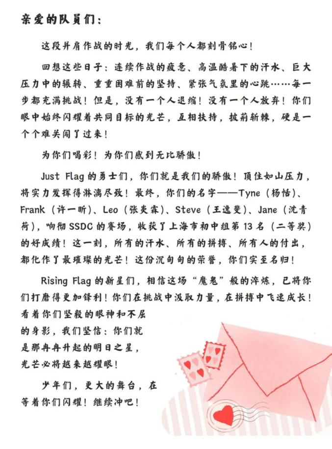 一个多月转瞬即逝,JUST FLAG战队获市辩论赛初中组第13名(二等奖)。队员们共同研讨、学习策略、关注时事,佳绩源于努力,祝贺他们!