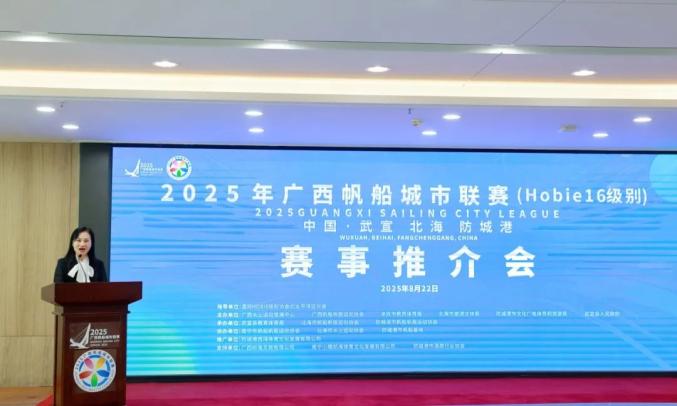 8月22日,2025年广西帆船城市联赛(Hobie16级别)赛事推介会在南宁市举行。广西水上运动发展中心主任陈超、国际HOBIE级别协会北太平洋区主席丁正航、广西帆船帆板运动协会主席叶剑华、广西水上运动发展中心副主任何延超、北海市旅游文体局副局长刘长义、防城港市文化广电体育和旅游局副局长陈文智,武宣县人民政府副县长梁璐等领导嘉宾,及参赛船队代表和技术官员代表等出席会议。