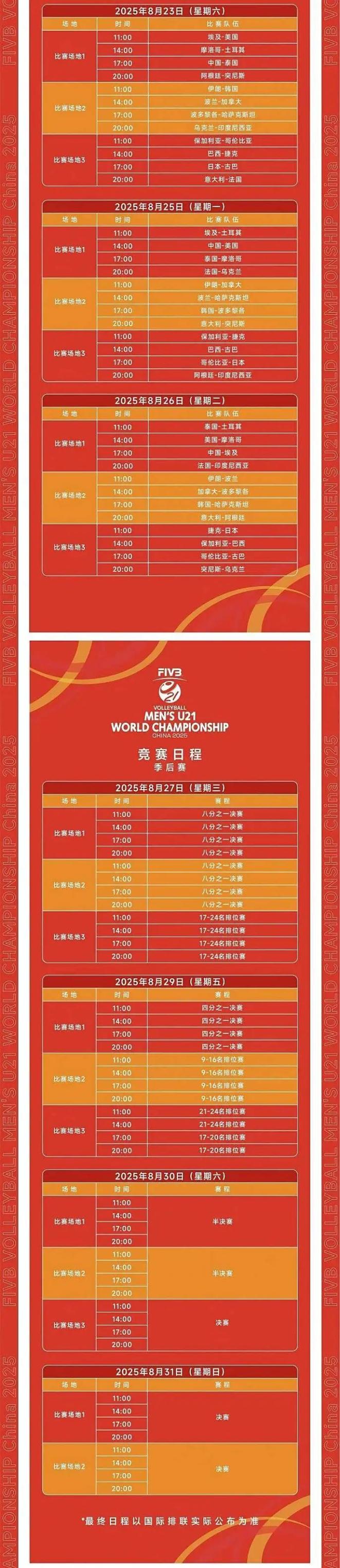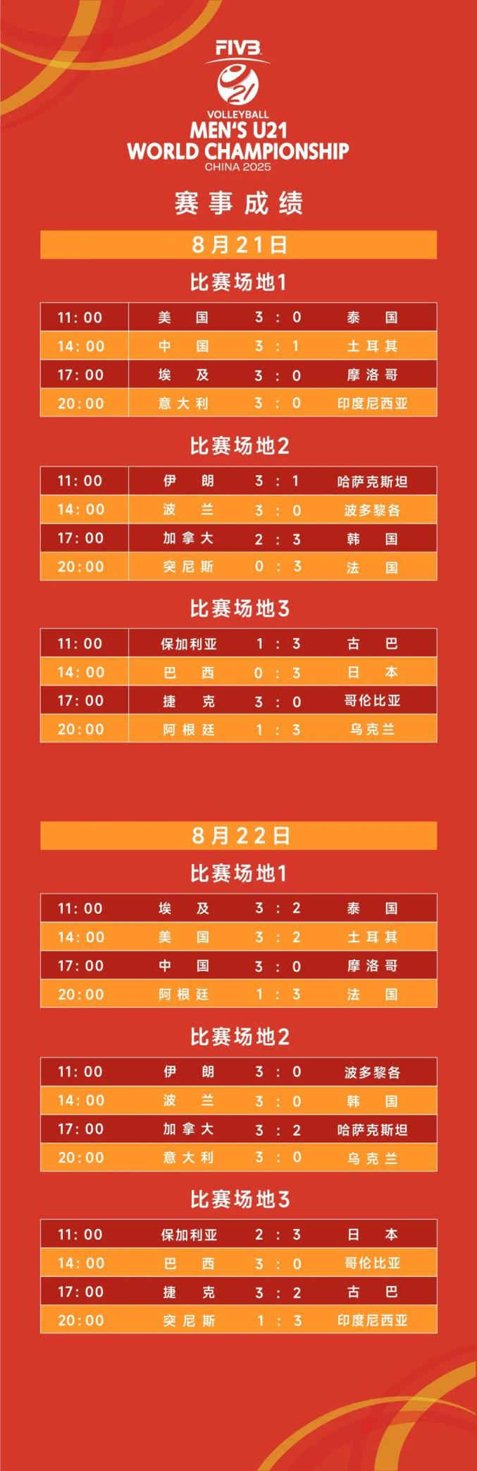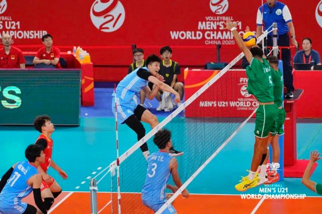 2025年8月22日,2025年世界U21男子排球锦标赛在广东江门体育中心体育馆进入比赛第二日。今日在广东江门体育中心体育馆展开12场激烈比拼。中国队对战摩洛哥队,以3比0完胜摩洛哥队取得两连胜,三局比分为25比13、25比17、25比20。