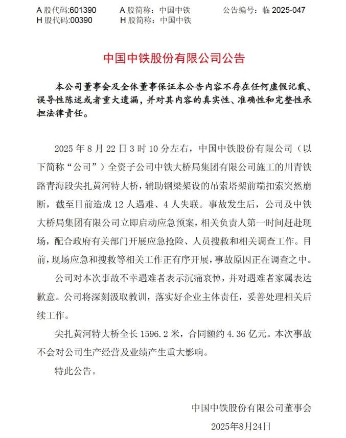 据上交所网站消息,中国中铁8月24日发布公告,8月22日3时10分左右,全资子公司中铁大桥局集团有限公司施工的川青铁路青海段尖扎黄河特大桥,辅助钢梁架设的吊索塔架前端扣索突然崩断,截至目前造成12人遇难、4人失联。事故发生后,公司及中铁大桥局集团有限公司立即启动应急预案,相关负责人第一时间赶赴现场,配合政府有关部门开展应急抢险、人员搜救和相关调查工作。目前,现场应急和搜救等相关工作正有序开展,事故原因正在调查之中。