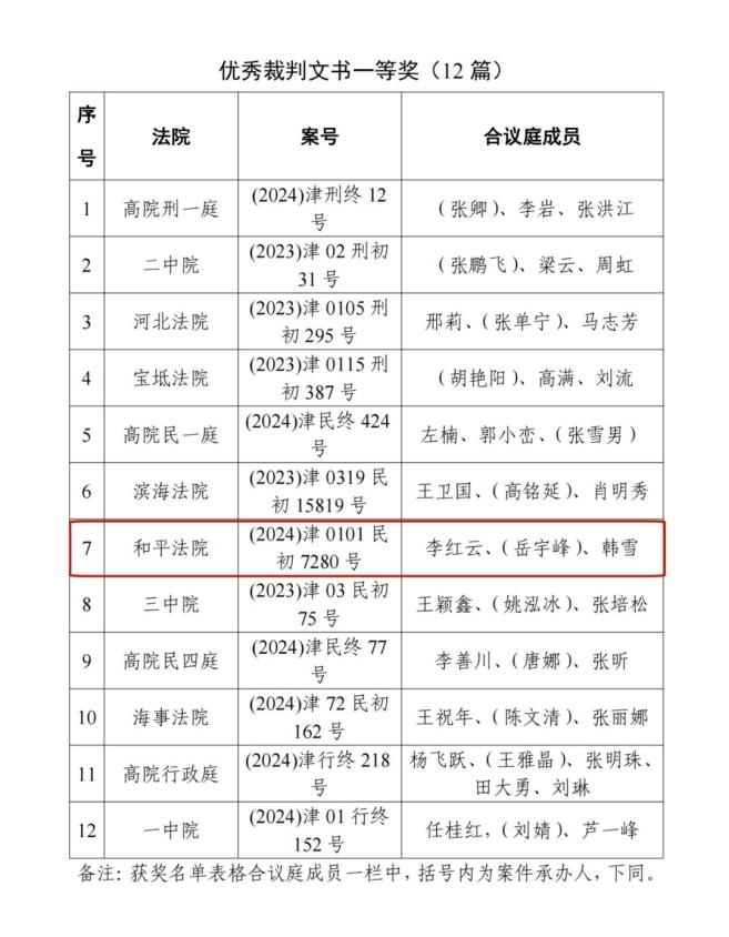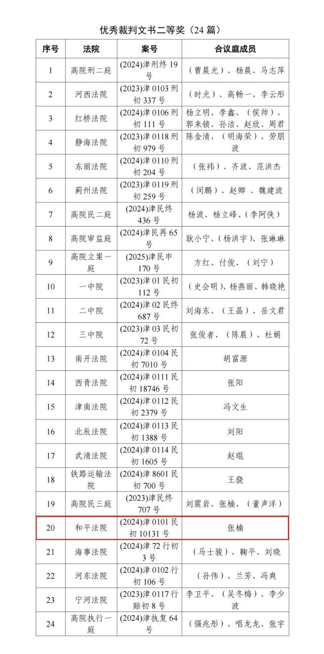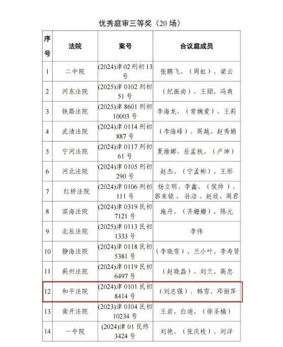 近日,天津高级人民法院公布2025年度天津法院优秀庭审、优秀裁判文书评选结果,评选出优秀裁判文书一等奖12篇、二等奖24篇、三等奖34篇;评选出优秀庭审一等奖10场、二等奖17场、三等奖20场;评选出优秀组织奖6个。