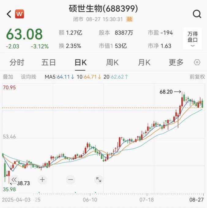 截至8月28日,硕世生物股价报63.08元/股,总市值为53亿元。