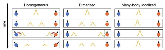 图2:无预热化机制时边缘态被移动的热激发破坏(左);预热化机制下边缘态无法与热激发相互作用,受到很好的保护(中);多体局域化将热激发束缚在原地(右)