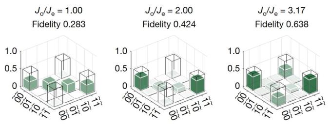 图3:被热激发破坏的逻辑贝尔态实验结果(左、中)受预热化机制保护的逻辑贝尔态实验结果(右)