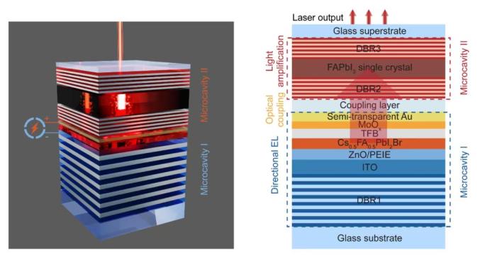 团队工作照“为了实现电驱动激光发射,我们发明了一种集成式的双腔结构。我们的方案是,将高功率微腔钙钛矿LED子单元与高质量单晶钙钛矿微腔子单元紧凑地集成在同一器件中”,狄大卫介绍。该器件将微腔钙钛矿LED在电激励下产生的大量光子高效地耦合到第二个微腔中,并激发单晶钙钛矿增益介质,产生激光。