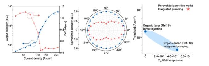 这种集成式激光器,包含可高效耦合的两个光学微腔(耦合效率达82.7%)。在电脉冲下,微腔钙钛矿LED子单元产生约2.5×104mW/cm2的峰值辐射功率密度,相当于约2.0×105 W/sr/m2的超高辐亮度。这个光功率被有效传递到单晶钙钛矿微腔中,并支持激光发射。