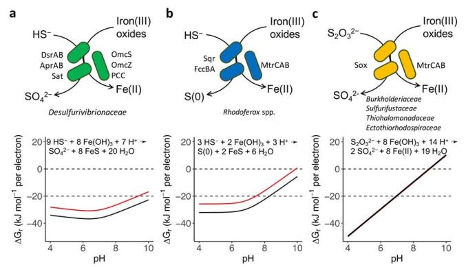 图1.微生物基因组大数据和热力学分析预测了三条硫氧化耦合三价铁矿还原的微生物代谢途径
