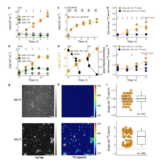 结合代谢产物检测、稳定同位素探针、纳米二次离子质谱(NanoSIMS)等技术手段,研究以Desulfurivibrio alkaliphilus为模式菌株,证实其可利用三价铁矿作为电子受体,将无定型硫化铁(FeS)或溶解态硫化物完全氧化为硫酸盐,并从中获得能量进行自养生长(图2)。