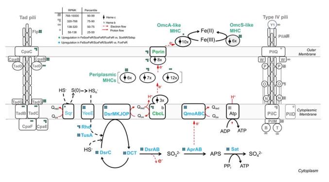 图2.Desulfurivibrio alkaliphilus利用硫化物和三价铁矿进行自养生长生理试验表明,D. alkaliphilus能够驱动硫化物氧化过程,竞争性地氧化环境浓度的溶解态硫化物(~50µM),并将其大部分完全转化为硫酸盐。转录组学分析揭示,D. alkaliphilus通过逆向异化硫酸盐还原途径(reversed dissimilatory sulfate reduction pathway)实现硫化物氧化,并通过多血红素细胞色素(multiheme cytochromes)将硫氧化释放的电子传递到胞外电子受体铁矿(图3)。宏基因组分析进一步表明,具有硫化物氧化耦合铁还原潜力的D. alkaliphilus近缘物种广泛存在于海洋沉积物、海底热泉、土壤、淡水湿地等生态系统,暗示微生物驱动的硫铁耦合循环具有广泛的环境分布。